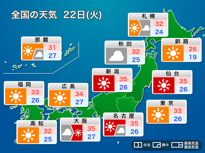 関東から九州も真夏らしい体感となります。明日の最高気温は、東京33℃、名古屋35℃、大阪35℃、福岡33℃の予想です。