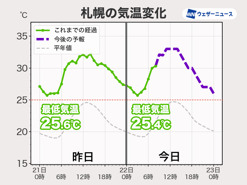 北海道で寝苦しい夜が続いています。今朝の最低気温は札幌市で25.4℃、網走市で25.8℃、紋別市で27.6℃など、25℃以上の熱帯夜になりました。