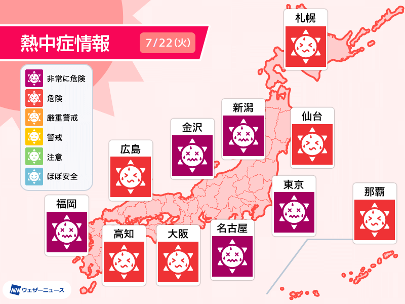 熱中症のリスクが高まり、沖縄から北海道まで全国の大部分が「危険」レベル、東京や名古屋など東日本の各地では「非常に危険」レベルになる見込みです。