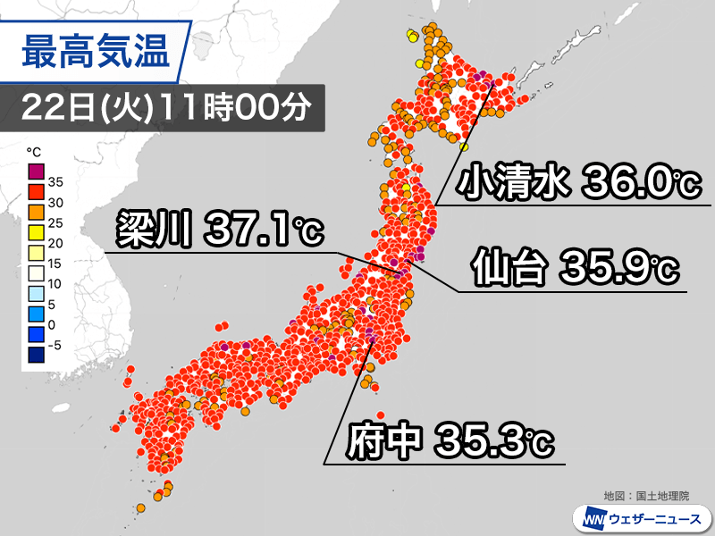 全国で最も気温が上がっている福島県伊達市・梁川は体温並みの37.1℃を観測。そのほか、仙台市で2日連続の猛暑日となる35.9℃、新潟市で35.5℃、東京都府中市で35.3℃など北日本、東日本を中心に35℃を超えています。