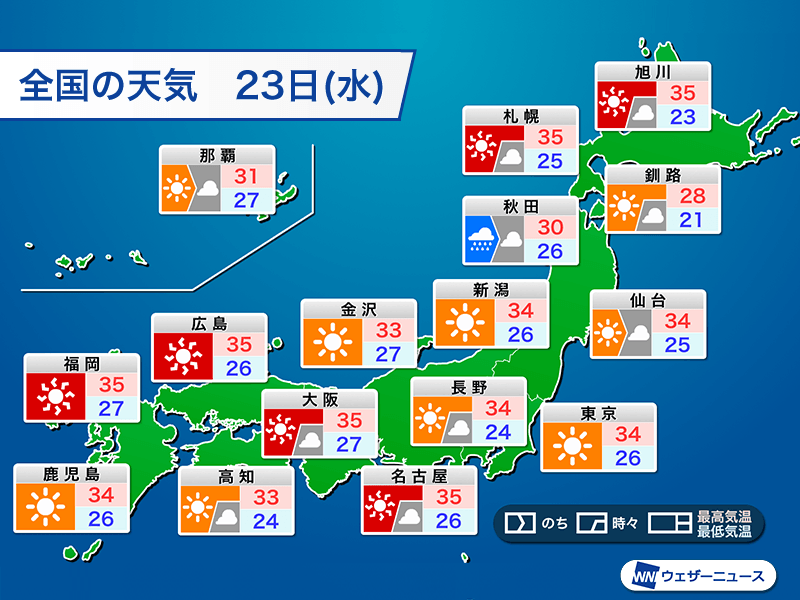 明日23日(水)も今日と同様に広い範囲で猛烈な暑さが予想されます。