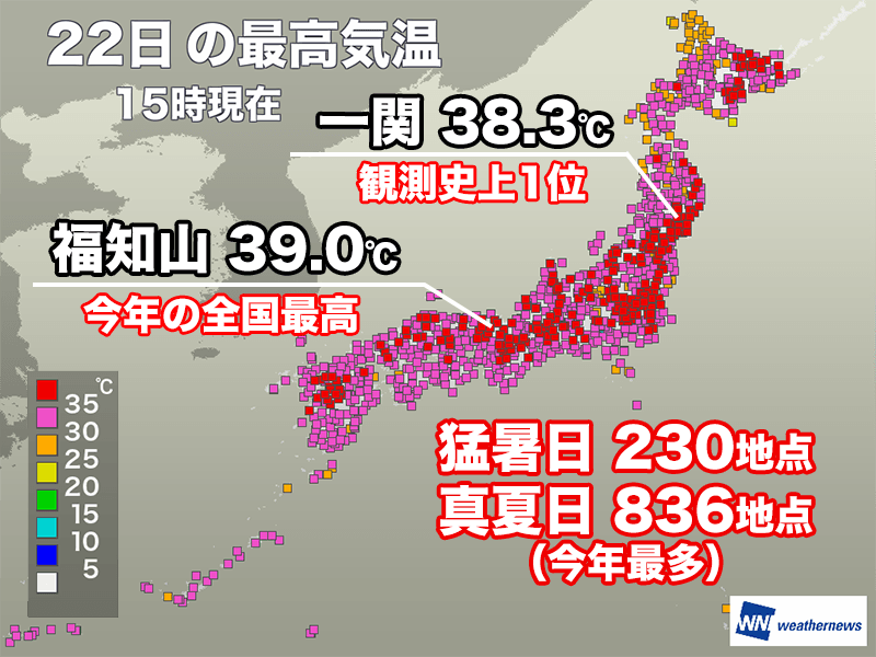 猛暑日、真夏日地点は今年最多 京都・福知山の39℃は今年最高