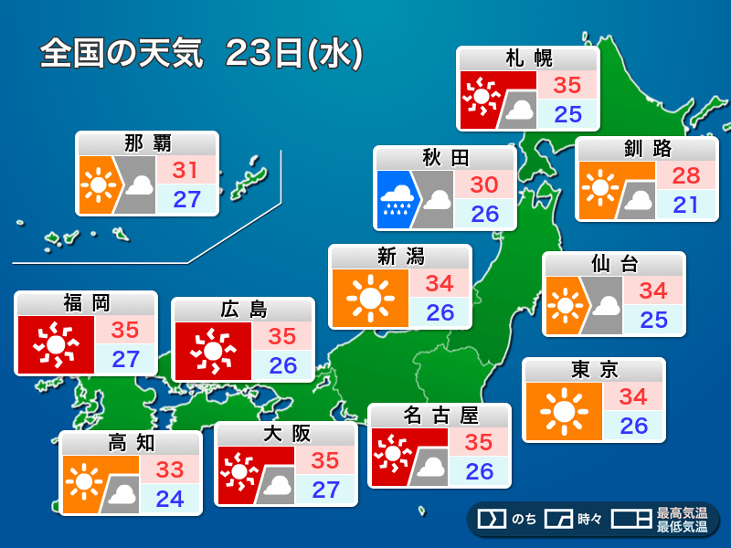 西日本から東北南部は夏空が続き、強い日差しが照りつけます。朝の早い時間から気温が上がって、昼間は35℃前後の暑さです。
