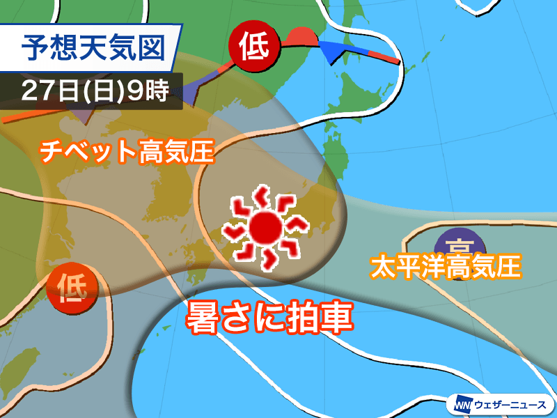 西日本や東日本は週末以降に暑さが増していきます。上空5500〜6000m付近を覆う太平洋高気圧は本州付近から朝鮮半島方面まで勢力を広げます。上空9000〜10000m付近を覆うチベット高気圧は26日(土)頃から東に勢力を拡大する予想です。
