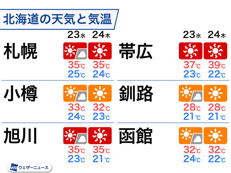 特に北海道は明後日24日(木)にかけて暑さのピークになります。特に道東は内陸部を中心に体温を上回るような危険な暑さで、帯広市は明日の最高気温が37℃、明後日は39℃の予想。帯広の観測史上1位の気温は2019年5月26日に記録した38.8℃ですので、これに迫る水準です。