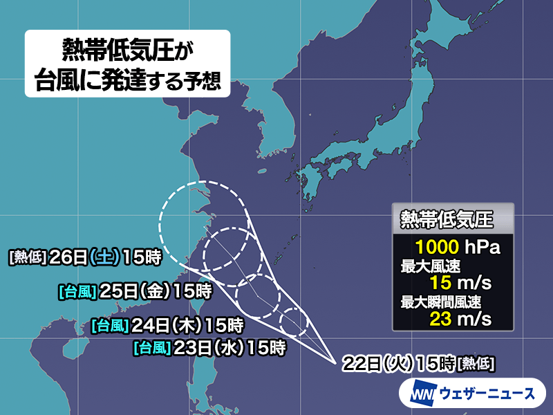 今日22日(火)12時に発生したこの熱帯低気圧は、今後勢力を強めて沖縄の南で台風に発達する可能性が高まってきました。