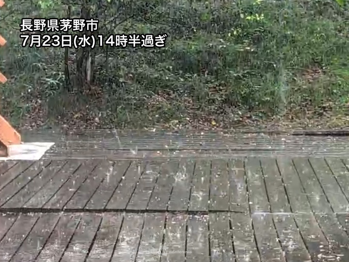 長野県茅野市のウェザーニュースアプリ利用者からは、土砂降りの雨に混じって雹の降っている様子が報告されました。山梨県内からも雹の報告があり、空の高い所まで発達した積乱雲の周辺では、この後も雹の可能性があります。