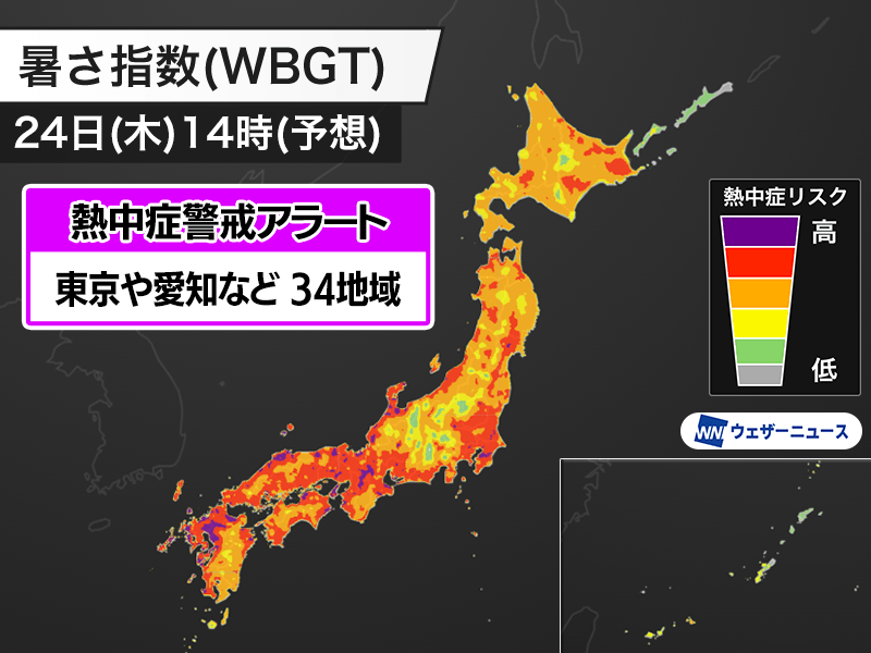 明日7月24日(木)の熱中症警戒アラート 東京都や愛知県など32都道府県に発表