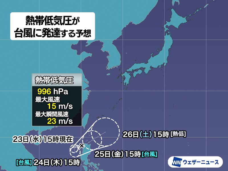 次に台風が発生すると、23日(水)に発生した台風7号以来で、台風8号と呼ばれることになります。台風になれば、今月6つめの台風発生となります。
