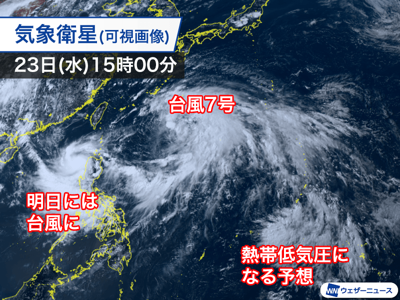 最も大きな雲が今日の朝に発生した台風7号です。台風特有の雲の渦はまだはっきりしませんが、大きく広がる活発な雨雲を伴っています。南シナ海の雲は台風7号に比べると小さいものの、渦はしっかりとしていて、明日24日(木)までには新たな台風となる見込みです。