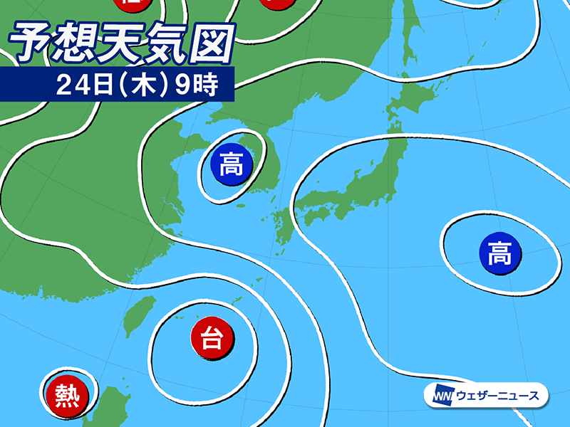 東北から九州は太平洋高気圧に覆われて、夏空が広がります。内陸部や山沿いでは大気の状態が不安定になり、昼頃から雷雨の可能性があるため、天気の急変に注意が必要です。