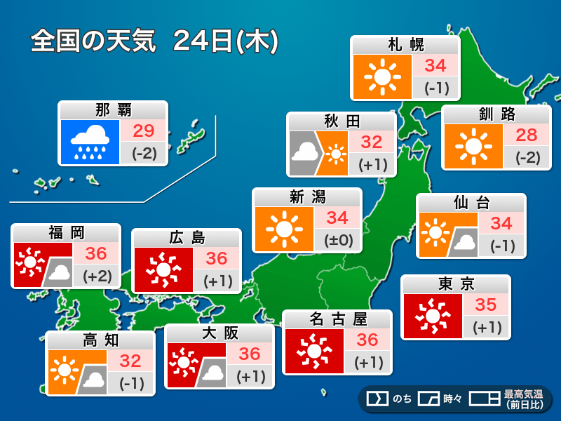 厳しい暑さは継続し、35℃以上の猛暑日の所が多くなります。体温を上回るような暑さの所もあるため、屋外での活動は最小限に留めた上で、万全な熱中症対策が必要です。