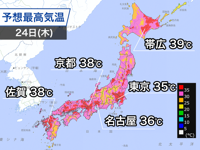 関東は平野部の広い範囲で35℃を超え、東海から近畿、九州北部でも各地で猛暑日になる見通しです。台風7号の北上で九州は南東の風がやや強まるため、北部ではフェーン現象によって福岡県久留米市や佐賀市などで38℃まで上がるとみられます。