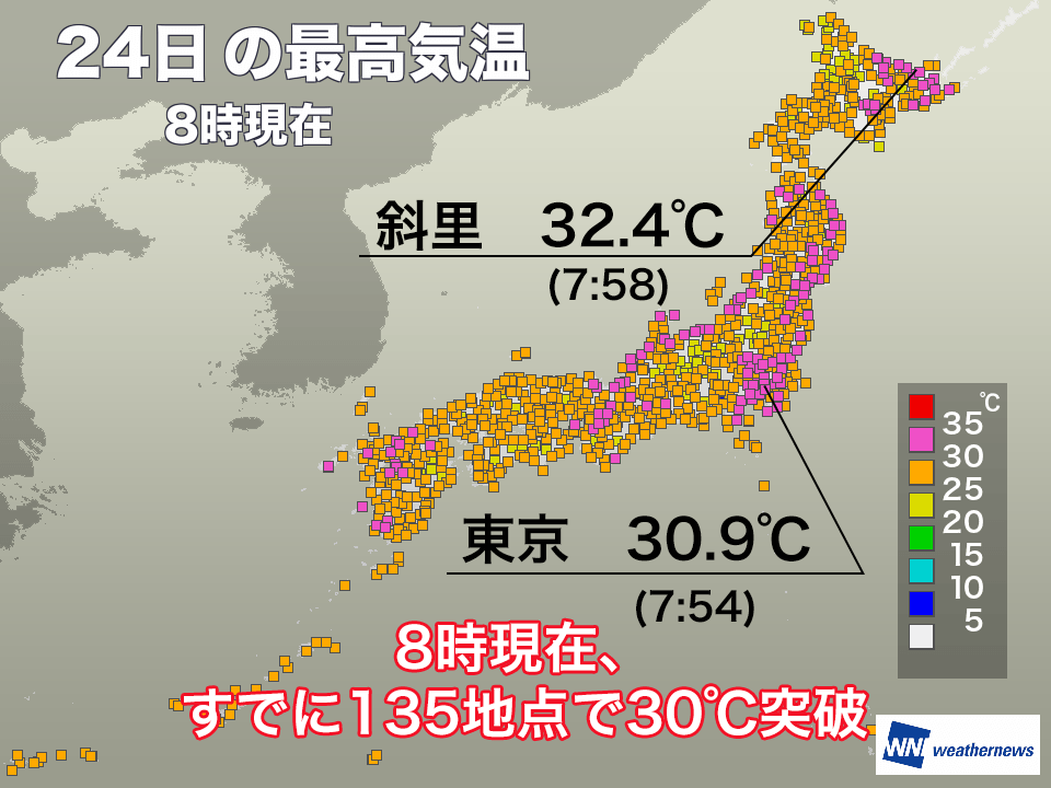 朝から気温が上昇し、東京や仙台では7時半前後には30℃に到達しました。8時時点ですでに全国135地点で30℃を超えていて、高い方から北海道・斜里で32.4℃、紋別で32.0℃となっています。