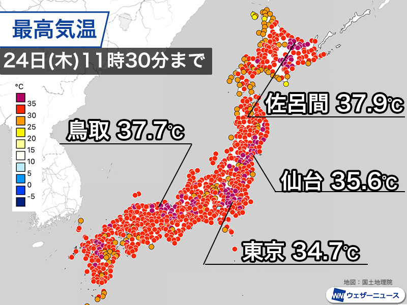 11時30分までに全国で気温が最も上がったのは、北海道佐呂間町で37.9℃です。次いで鳥取市で37.7℃、北海道北見市で37.5℃など、すでに体温並みかそれ以上の危険な暑さになっています。