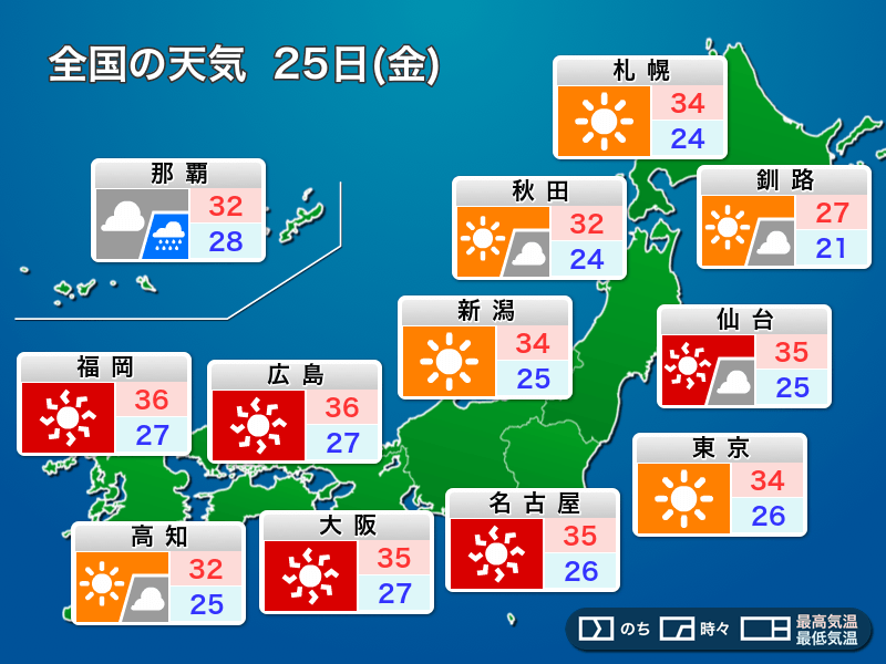 引き続き全国的に気温は高めです。最高気温が35℃以上の猛暑日となるところが多く、各地で厳しい暑さが続きそうです。