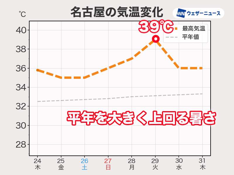 最も気温が高くなる来週29日(火)頃には、名古屋市や岐阜市、京都市で39℃まで上がる予想となっています。7月に入ってから厳しい暑さが続いている所に、さらなる酷暑になるため、体にはかなり堪えそうです。