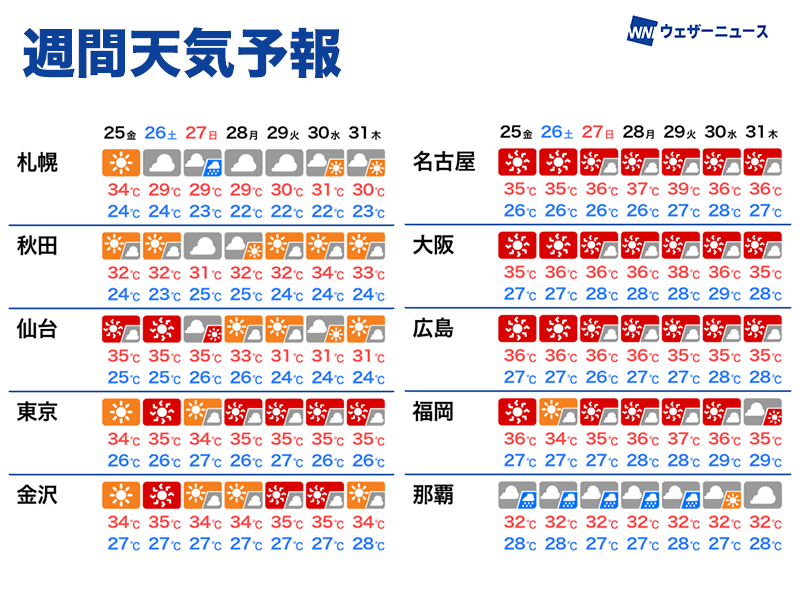 一方、北海道では週末以降は前線の影響で雲が多くなります。記録的な高温は一段落し、道内各地で最高気温は30℃前後となる見込みです。