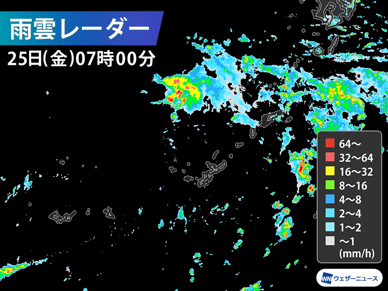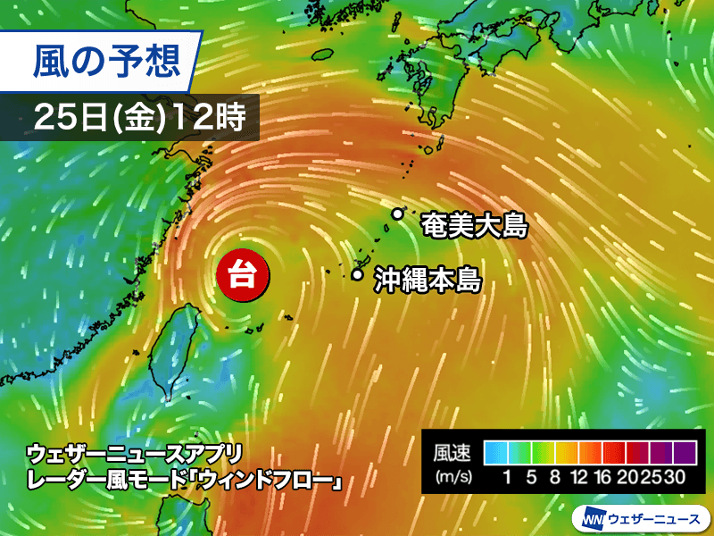 昨日24日(木)から沖縄本島や宮古島、奄美は台風7号の強風域に入り、25日(金)7時時点でも強風域圏内です。