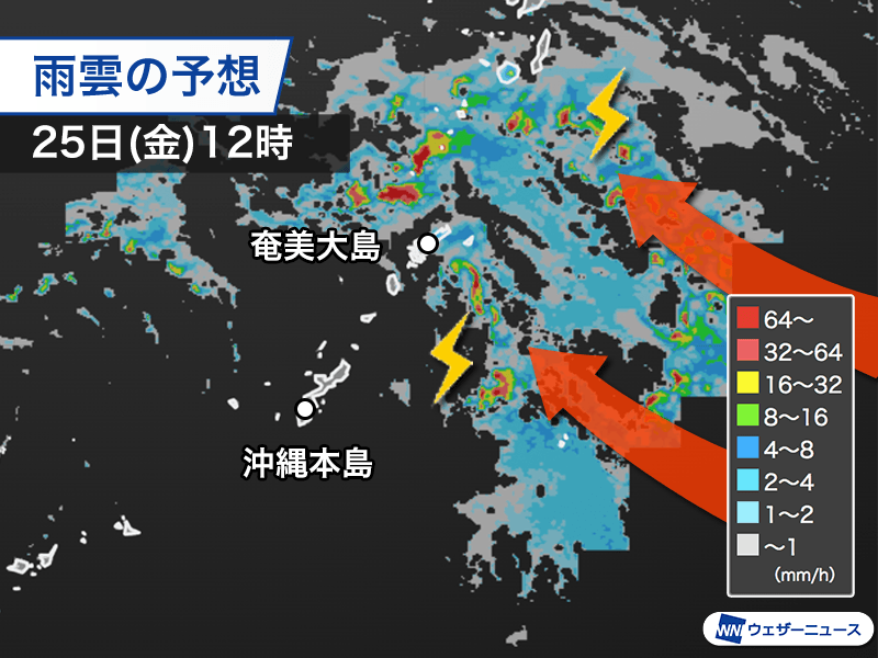 今日25日(金)になってからは、風のトーンは少し落ち着いてきましたが、それでも北大東島で未明に最大瞬間風速20.1m/sの強い風が吹きました。那覇市でも0時頃に最大瞬間風速15.3m/sを観測しました。
