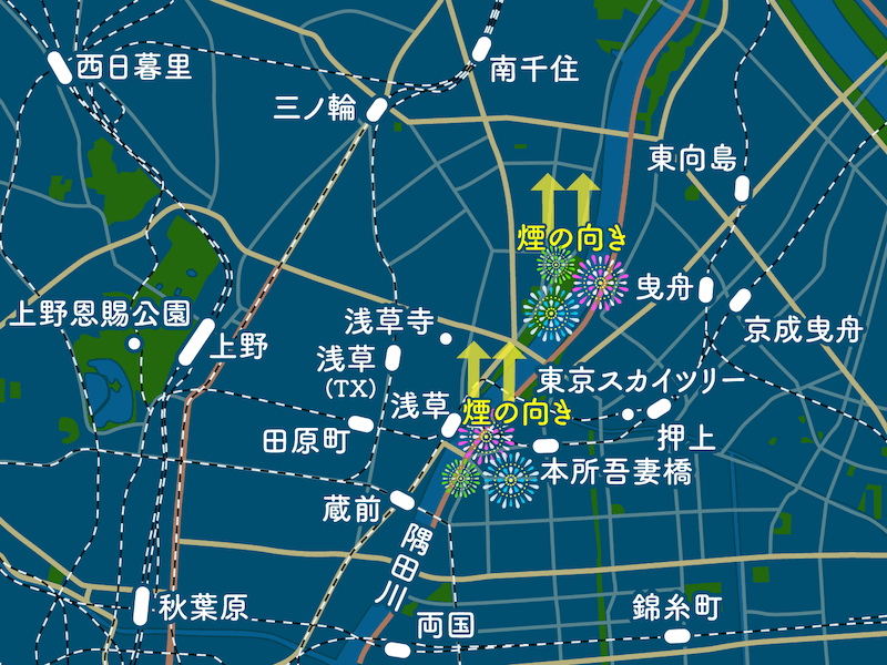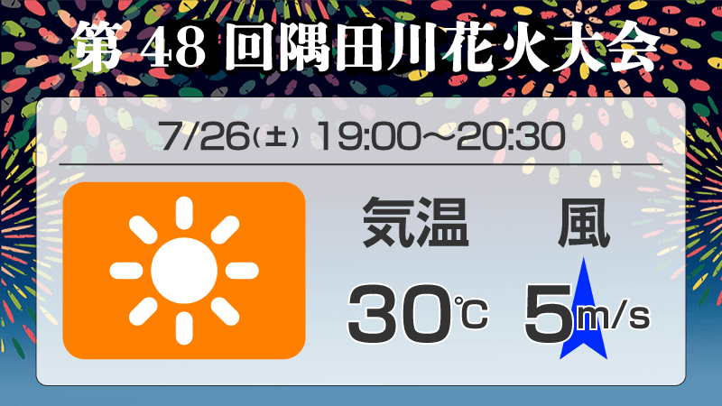 花火大会開催中は南寄りの風が吹き、花火の煙は北に流れる見通しです。風下からの観覧は煙で霞むことも考えられますが、隅田川の両岸からの観覧には問題のない風向きといえそうです。