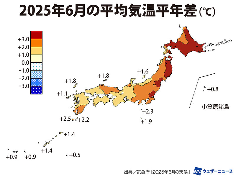 気象庁によると、6月は全国153の気象台等のうち122地点で、月平均気温が6月として歴代1位の高温となり、特に北日本で+3.2℃、東日本が+2.3℃、西日本+1.8℃となりました。日本の月平均気温は、1898年以降で6月として最も高かったのです。