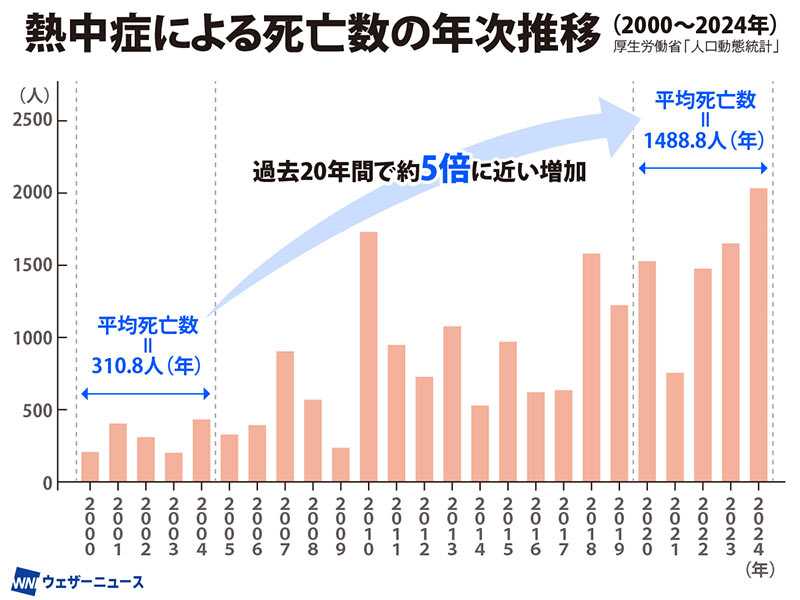 年々暑さが厳しくなるなか、非常に心配なデータがあります。熱中症による死亡者数が増えているのです。2000〜2004年の年平均より2020〜2024年平均は5倍近く増加しています。