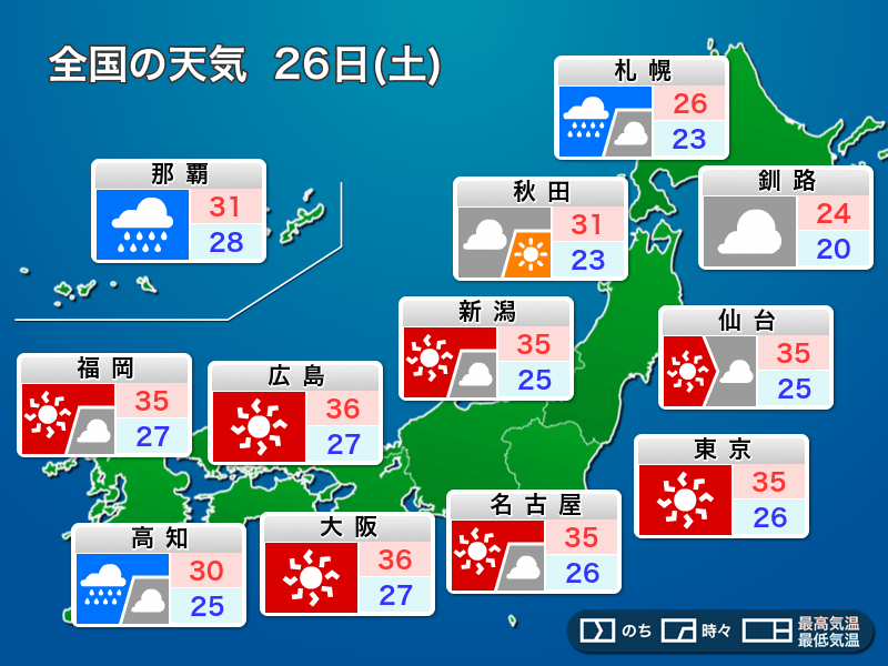 週末ですが、昼間は危険な暑さとなるので屋外で過ごす時間を短くした方が安心です。屋内にいても冷房の活用が欠かせません。