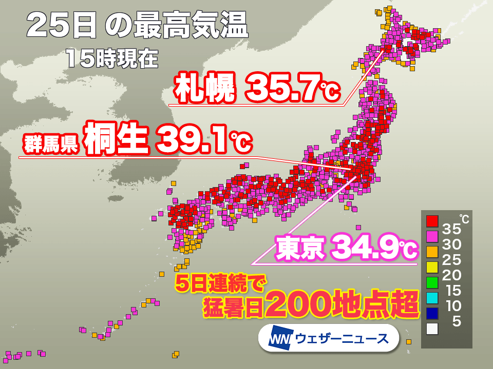 今日25日(土)15時時点で35℃以上を観測した猛暑日地点は267地点になりました。30℃以上の真夏日地点は808地点となり、5日連続で猛暑日が200地点、真夏日が800地点を上回りました。
