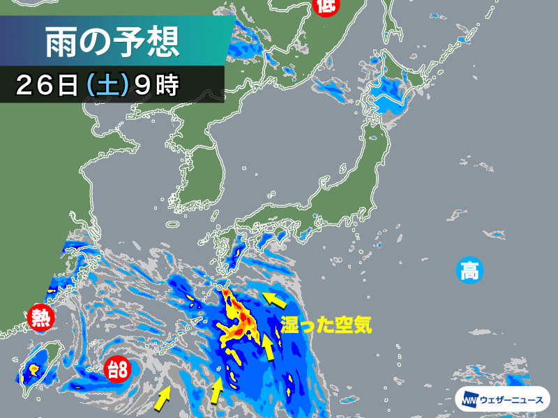 台風8号(コメイ)が沖縄に接近しています。台風はこのあと日中に勢力を落として熱帯低気圧に変わる予想ですが、台風周辺の湿った空気や太平洋高気圧の縁辺をまわる湿った空気の影響で、沖縄〜西日本の太平洋側では雨の降るところがあります。