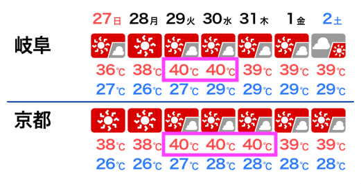 来週は京都で3日、岐阜でも2日連続40℃に達する予想です。これまで以上の対策が急務となります。
