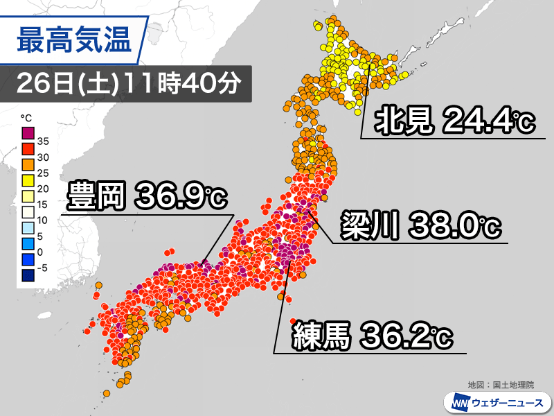 11時40分までの最高気温は福島県伊達市・梁川で38.0℃まで上昇し、6日連続で38℃以上になりました。そのほか、群馬県桐生市で37.5℃、東京都練馬区で36.2℃を観測。フェーン現象の影響がある福井市や兵庫県豊岡市なども36℃以上です。