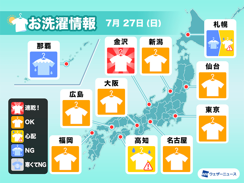 東日本から九州北部にかけての各地では、ギラギラと盛夏の太陽が活躍して洗濯物が朝からよく乾きそうです。しかし、昼ごろ以降はにわか雨が一時的に強まる可能性もあるため、長時間の外出時は部屋干しが安心です。