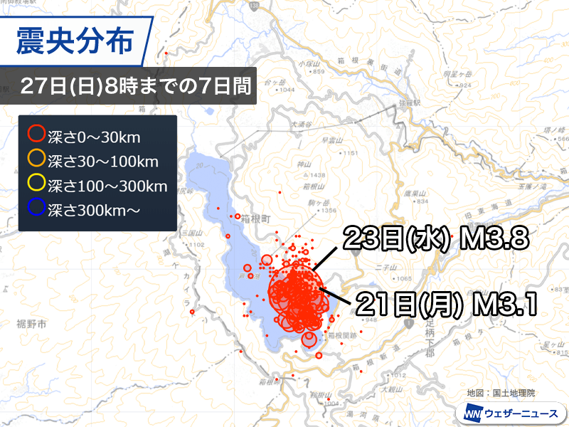 箱根・芦ノ湖付近では小さな地震を含めると20日(日)頃から地震が頻発し、21日(月)にマグニチュード3.1、最大震度2の地震が発生しました。
