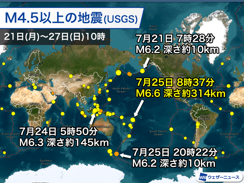 アメリカ地質調査所の解析によるマグニチュード6以上の地震は7回発生しています。最も大きな地震は、南太平洋サモアの近海で発生したマグニチュード6.6です。