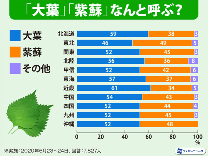 アンケート結果(上記)では近畿が最も『大葉』と呼ぶ割合が高くなっていますが、これは大阪が明治時代、『割烹』という料理法・飲食スタイル(=後に広く日本料理となったもの)の発祥の地で、料理文化が花開いたことと関係していると思われます。