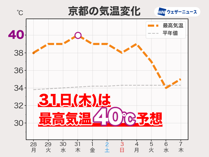 31日(木)には京都で最高気温40℃が予想されています。これまで以上の暑さ対策が急務となります。