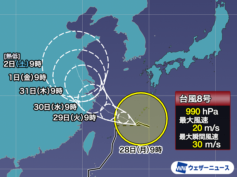 再び台風勢力となった台風8号は今日28日(月)の日中に沖縄本島付近を通過して、その後は東シナ海を西北西に進んで沖縄から離れる予想です。