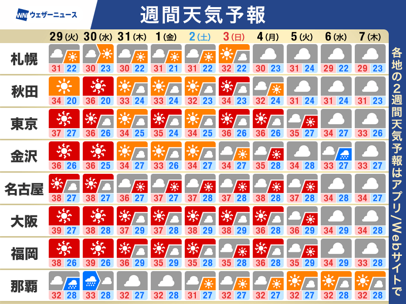 今日時点で、30日(水)は京都市と岐阜市、31日(木)は京都市で最高気温40℃が予想されています。また、京都は期間を通じて予想最高気温が39℃以上となっています。これまで以上の暑さ対策が急務となります。