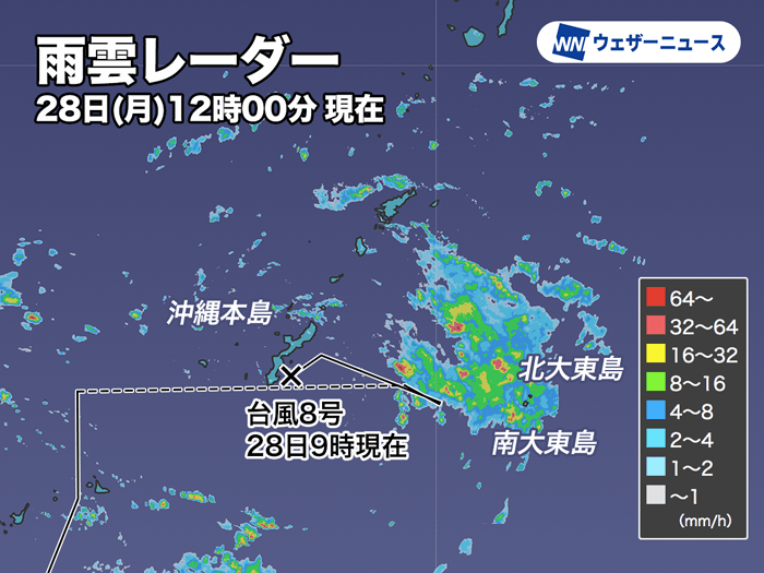 今日28日(月)9時には、台風8号の強風域は北東側500km、南西側280kmと発表されています。