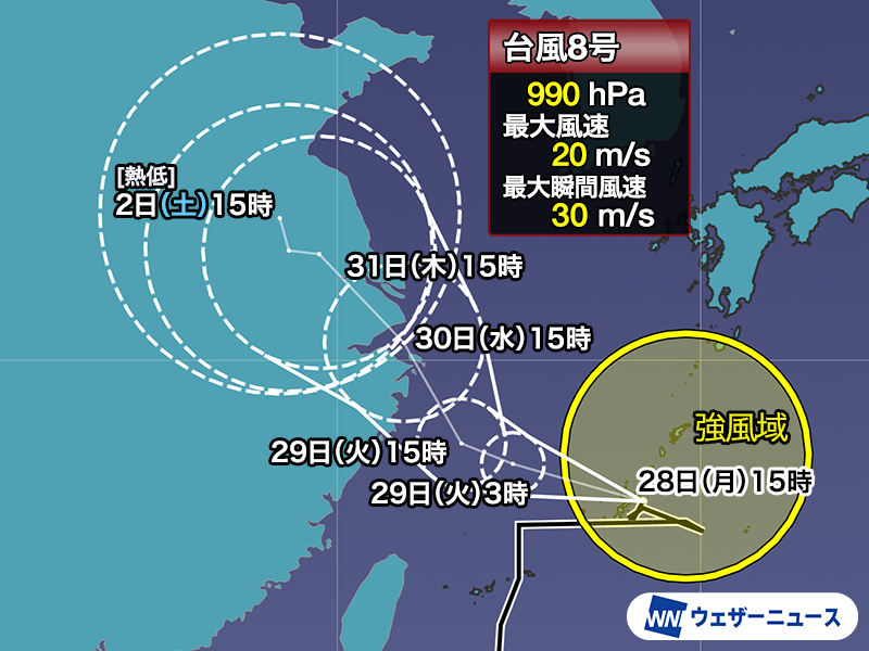 台風8号は、今日28日(月)の日中には沖縄本島付近で動きが遅くなっています。今夜以降は東シナ海を西北西に進んで沖縄から離れる予想です。