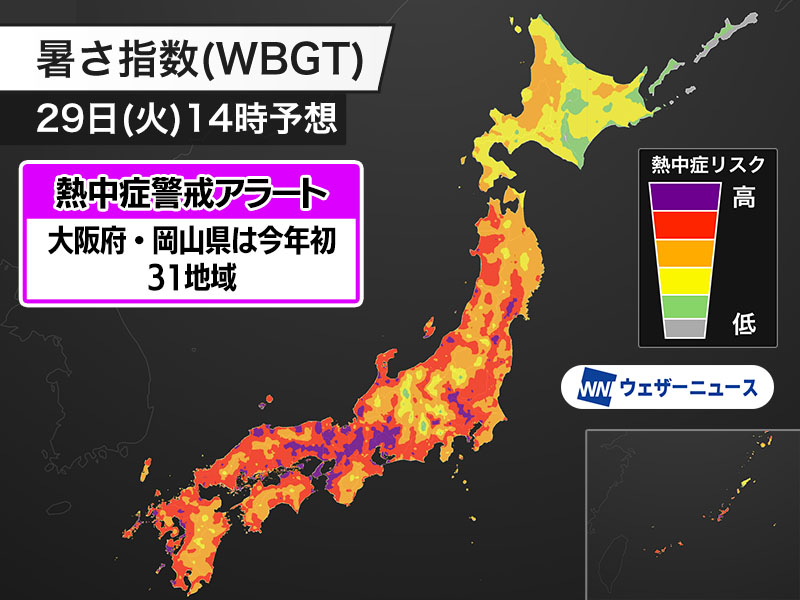 明日7月29日(火)の熱中症警戒アラート 東京含む31地域に発表 大阪府と岡山県は今年初
