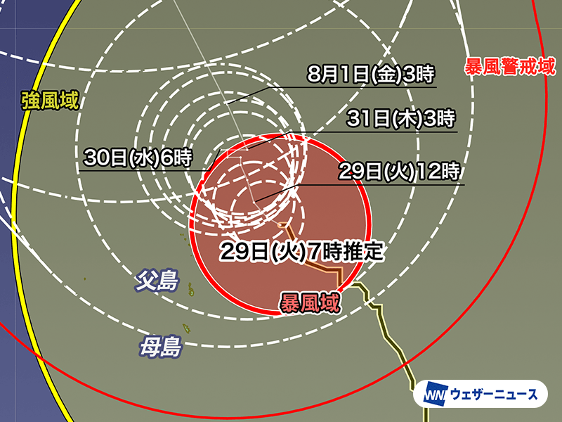 父島など小笠原諸島の近くに8月1日(金)頃にかけて居座り、強風や高波の影響が長い期間続く見込みです。予報円の西寄りの進路をとった場合には小笠原諸島にかなり接近するおそれがあり、台風の外側の活発な雨雲が父島や母島にかかる可能性があります。雨の強まりや落雷、突風にも注意してください。