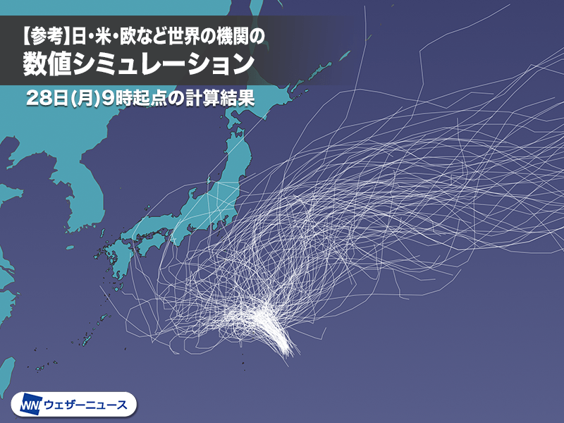 これらを比較すると、小笠原諸島の北まで北上する傾向は概ね揃っているものの、その後はコースにかなりのばらつきがあることがわかります。現時点では、紀伊半島の南くらいまで西寄りの進路を示すコースもあるものの、本州の南で東寄りへ進路を変える予測が多数派となっています。日がたつにつれて誤差は縮小する見込みですので、今後の情報にご注意ください。