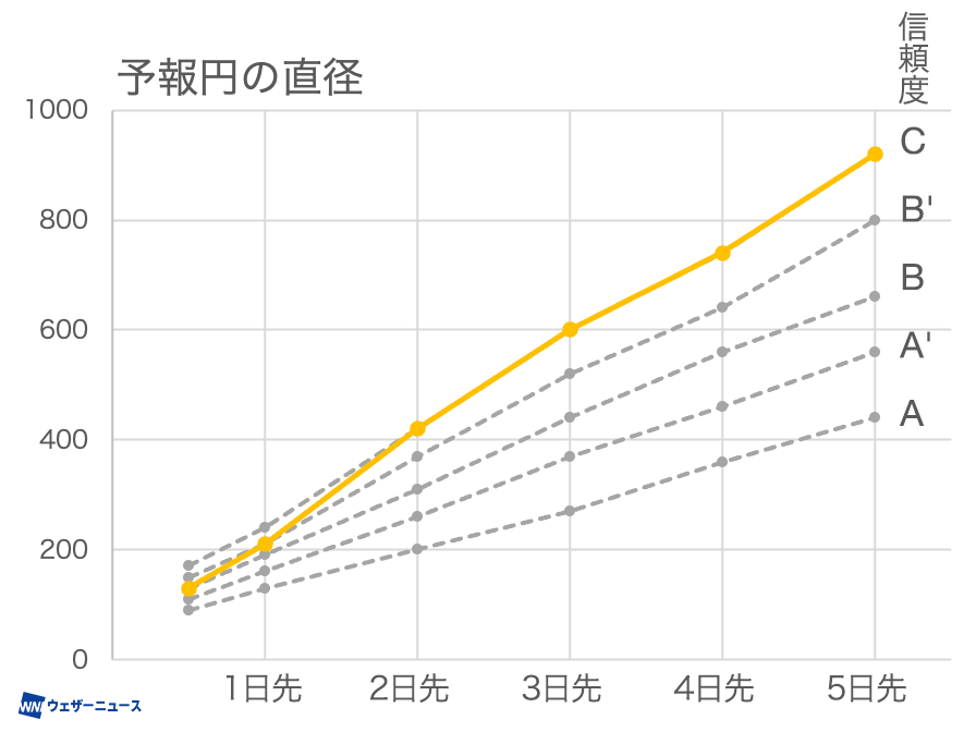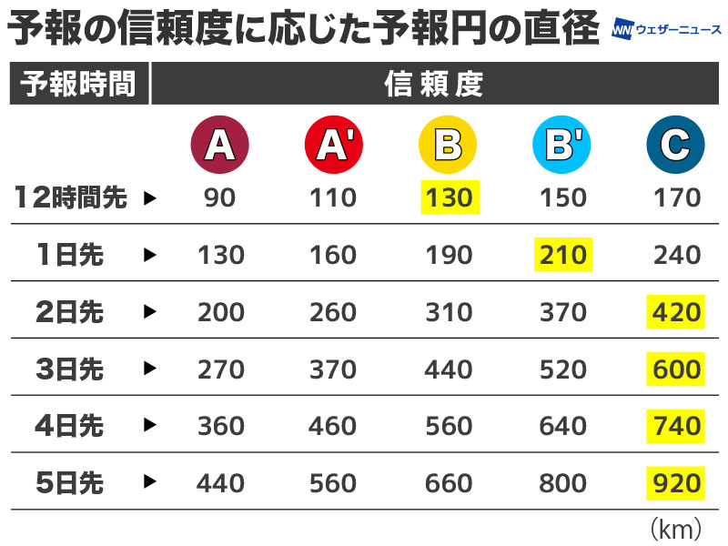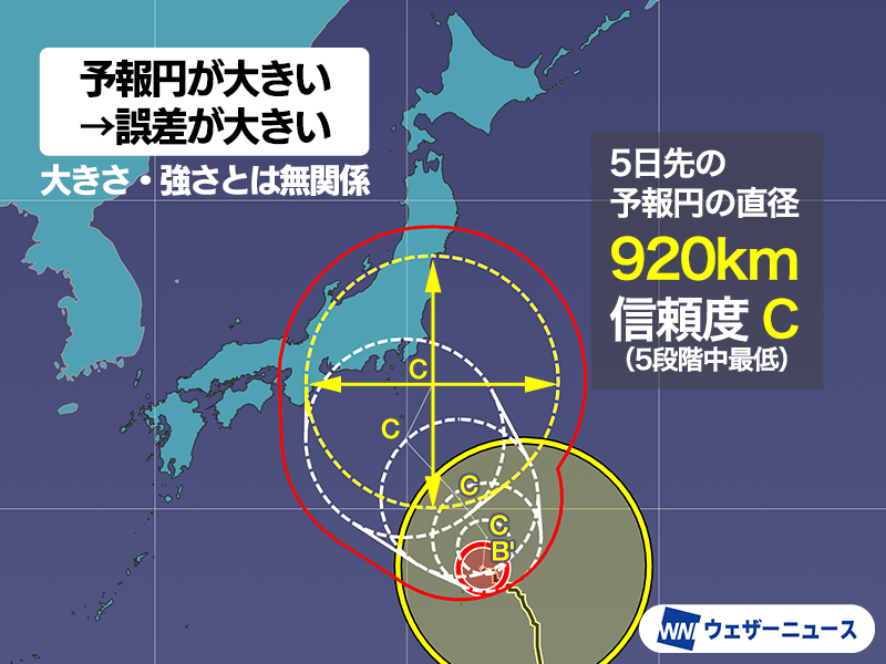 台風進路図・予報円の広さは誤差を示す 「強さ」「大きさ」とは無関係
