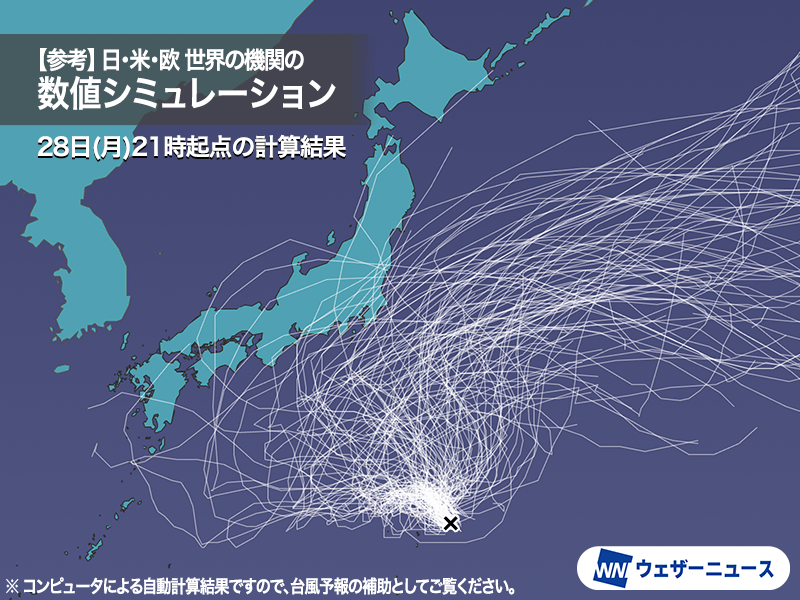 これらを比較すると、小笠原諸島から北上を開始した後はコースにかなりのばらつきがあることがわかります。最新の予測では本州の南に進むものが増加し、陸地にかなり近づく予測もみられる状況です。日がたつにつれて誤差は縮小する見込みですので、今後の情報にご注意ください。