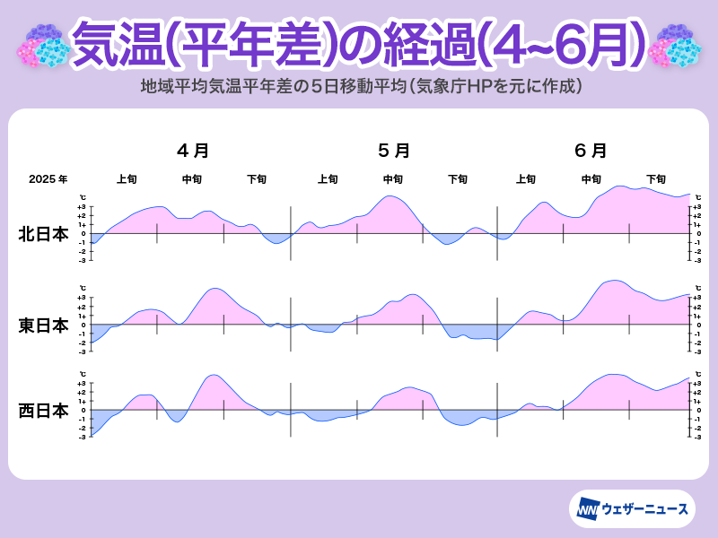 東日本や西日本では、気温が高い日が多かったものの、昨年秋の記録的な高温の影響を受けて開花が平年より遅くなったところがありました。あじさいの開花はその年の気温だけではなく、前年秋の気温が花芽の生長に影響を及ぼすとされています。