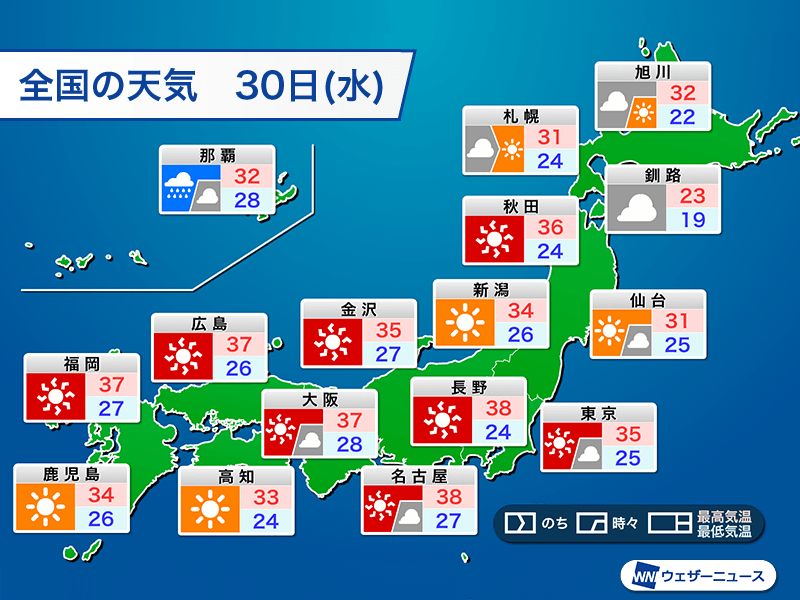 明日30日(水)も上空の高い所まで高気圧に覆われ、本州の各地で猛烈な暑さが続く見通しです。
