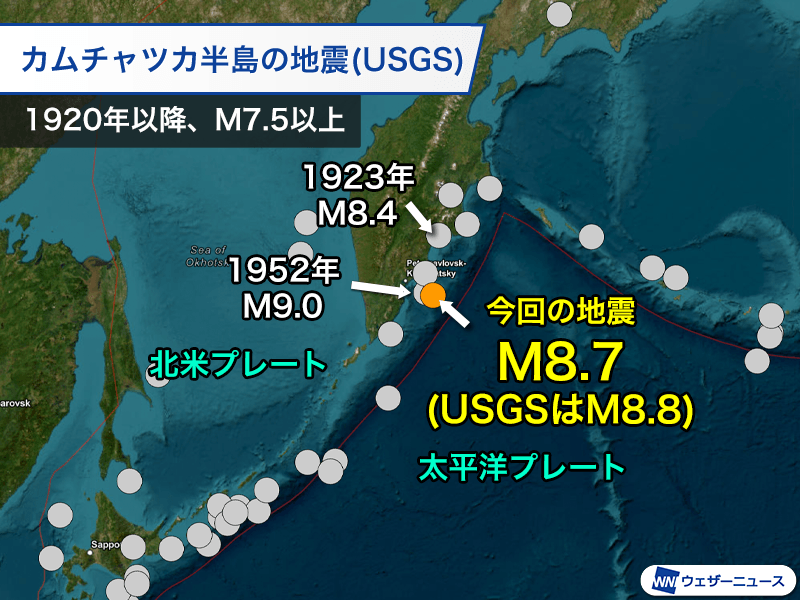 ロシア・カムチャツカ半島の南東沖を震源とするマグニチュード8.7と推定される地震が発生しました。発生直後はマグニチュード8.0と解析されましたが、その後の精査により上方修正されています。(USGS:アメリカ地質調査所はさらに上方修正しマグニチュード8.8、深さ約21kmと解析)