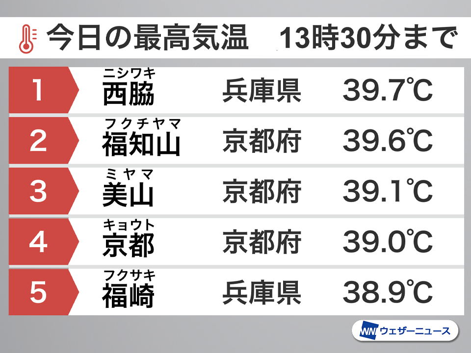 特に近畿や中国地方にで気温の上昇が目立ち、13時30分までの最高気温は全国トップの兵庫県西脇市で39.7℃。次いで京都府福知山市が39.6℃、南丹市・美山が39.1℃、京都市が39.0℃と上位は軒並み近畿です。